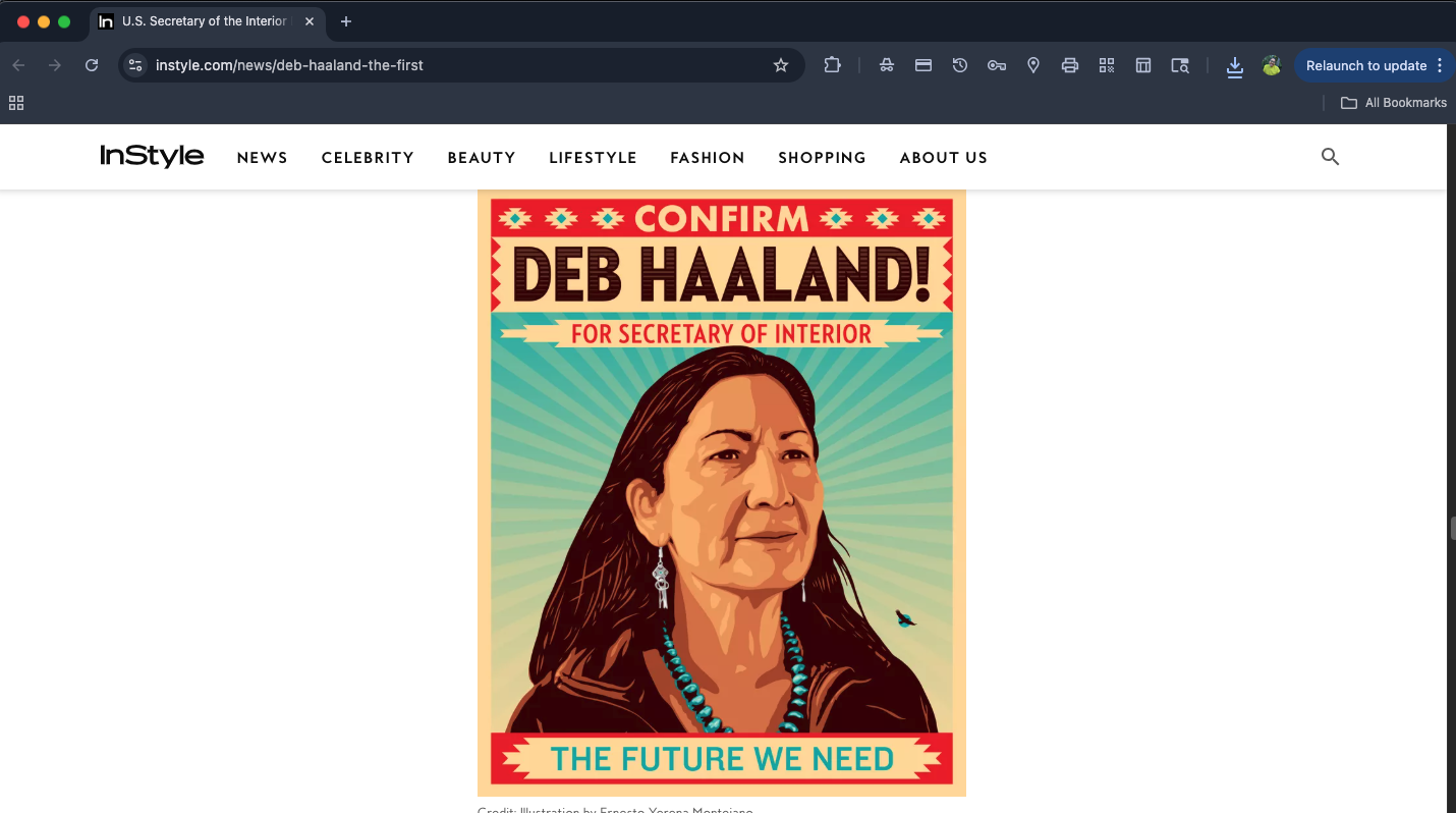 Direct Artist during development of concept, execution of art piece and integration of feedback. In collaboration with Illuminative, a Native-led organization, we commissioned an art piece from Ernesto Yerena in order to advocate and support Deb Halaands’ nomination and selection as the Interior Secretary for the Biden/Harris administration in 2021. Layel Camargo, led the direction of the art commission, advised artist and provided feedback.